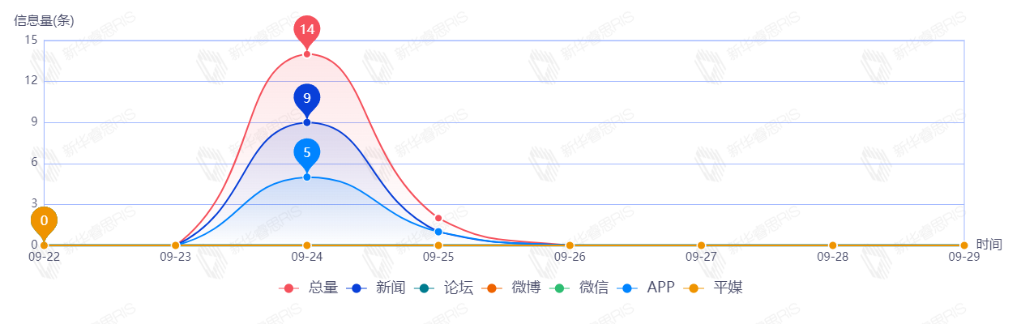 截至目前,该文章在互联网上传播总量16篇。其中9月24日是传播的高峰期,共传播14篇文章。各信源的信息发布情况中,新闻信息占比最大,其次是APP,占比分别为76.92%、23.08%。(数据来源:新华睿思数据云图分析平台)