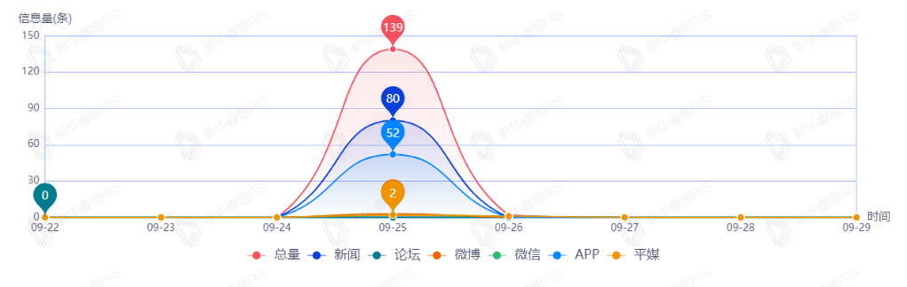 截至目前,该文章在互联网上传播总量141篇。其中9月25日是传播的高峰期,共传播139篇文章。各信源的信息发布情况中,新闻信息占比最大,其次是APP和平媒,占比分别为64.52%、28.23%、2.42%。(数据来源:新华睿思数据云图分析平台)