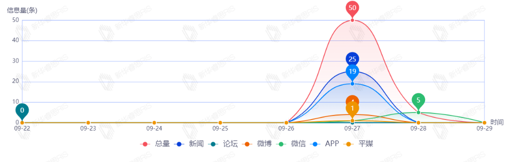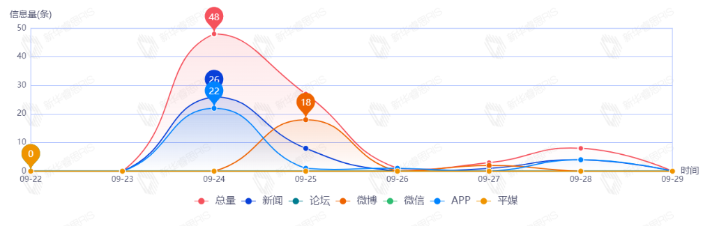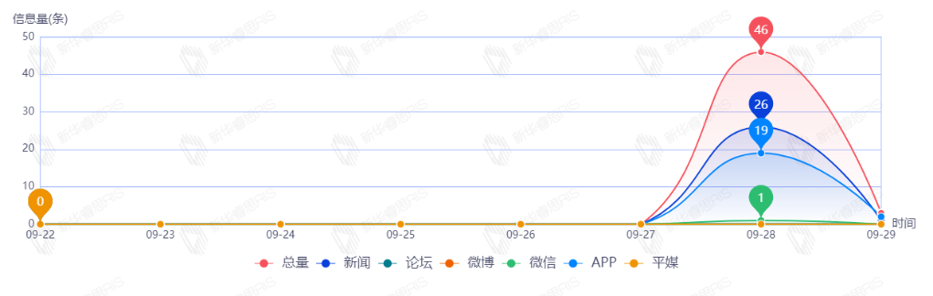 截至目前,该文章在互联网上传播总量49篇。其中9月28日是传播的高峰期,共传播46篇文章。各信源的信息发布情况中,新闻信息占比最大,其次是APP和微信,占比分别为58.70%、39.13%、2.17%。(数据来源:新华睿思数据云图分析平台)