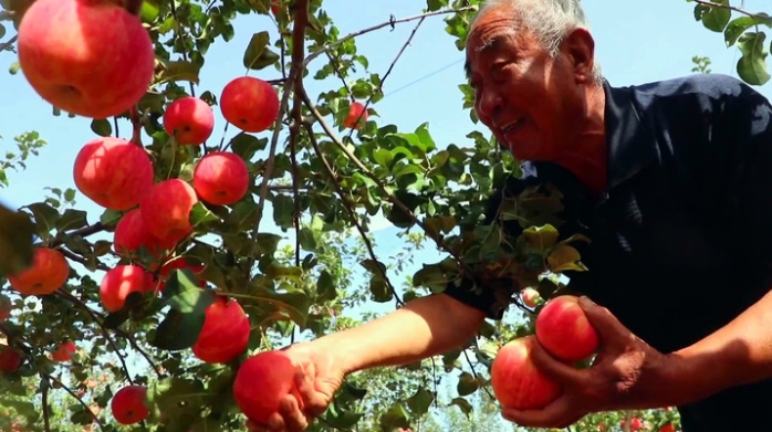 金秋时节,吕梁山上瓜果飘香,黄河岸边硕果累累。走进山西省临汾市大宁县昕水镇白杜村宁脆苹果产业示范基地,果农马旭平正在果树间忙碌作业。阳光洒下,映红了苹果,晒黑了他的脸颊。(新华社记者王飞航)