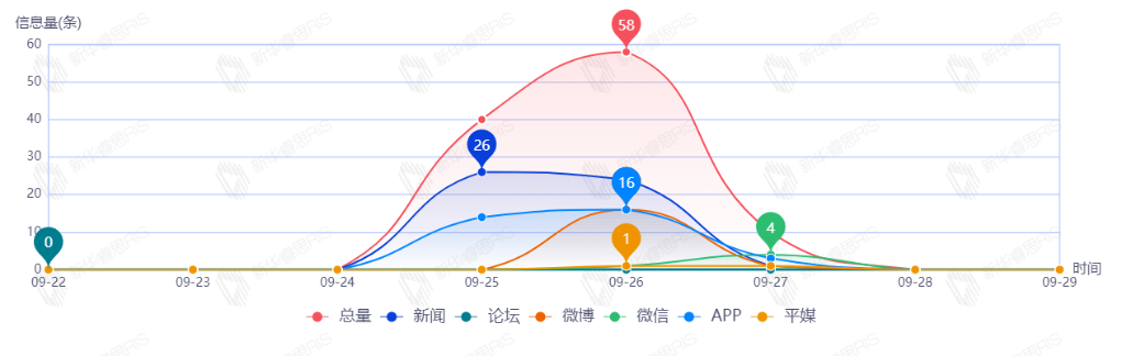截至目前,该文章在互联网上传播总量108篇。其中9月26日是传播的高峰期,共传播58篇文章。各信源的信息发布情况中,新闻信息占比最大,其次是APP和微博,占比分别为53.68%、21.05%、17.89%。(数据来源:新华睿思数据云图分析平台)
