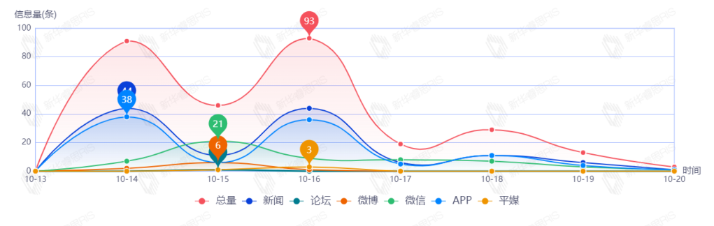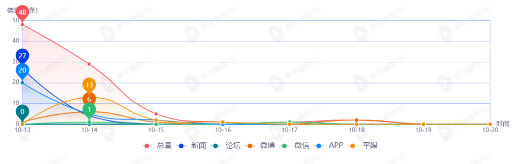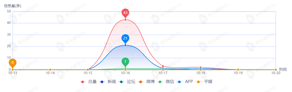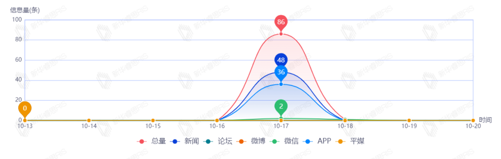 截至目前,该文章在互联网上传播总量48篇。其中10月16日是传播的高峰期,共传播43篇文章。各信源的信息发布情况中,新闻信息占比最大,其次是APP和微信,占比分别为58.97%、35.90%、5.13%。(数据来源:新华睿思数据云图分析平台)