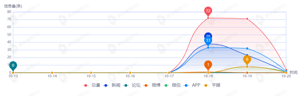 截至目前,该文章在互联网上传播总量147篇。其中10月18日是传播的高峰期,共传播72篇文章。各信源的信息发布情况中,新闻信息占比最大,其次是APP和微信,占比分别为48.44%、37.50%、7.03%。(数据来源:新华睿思数据云图分析平台)