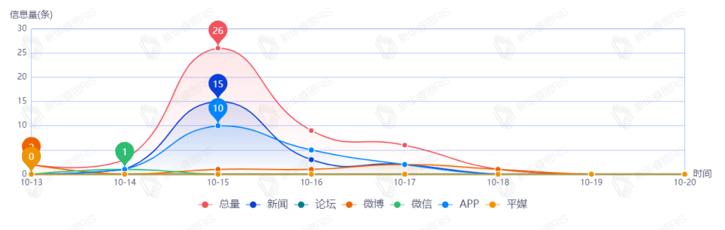 截至目前,该文章在互联网上传播总量47篇。其中10月15日是传播的高峰期,共传播26篇文章。各信源的信息发布情况中,新闻信息占比最大,其次是APP和微博,占比分别为50.00%、30.95%、16.67%。(数据来源:新华睿思数据云图分析平台)