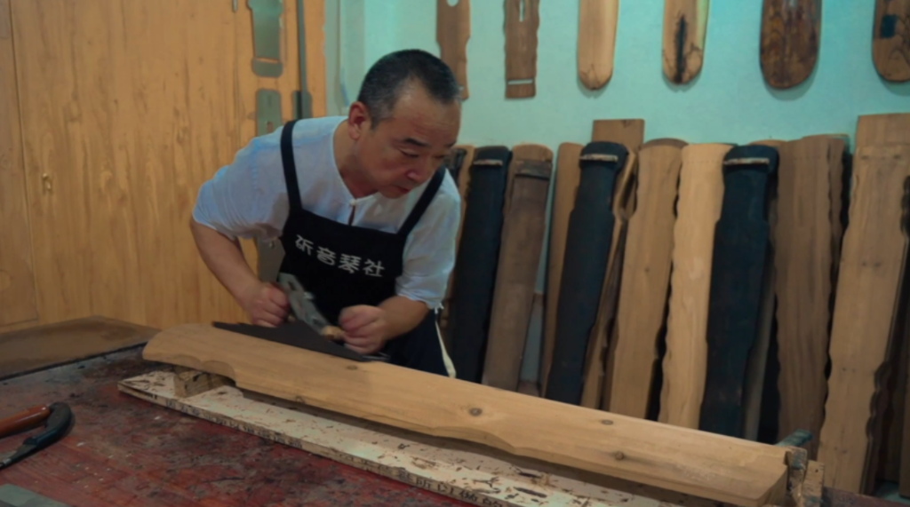 古法手斫古琴,包括择材、造型、刮灰、打磨、上漆、上弦等十几个步骤,两百多道工序。