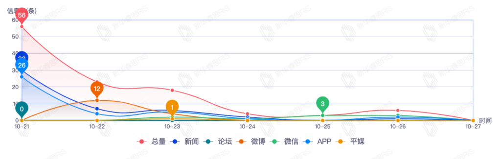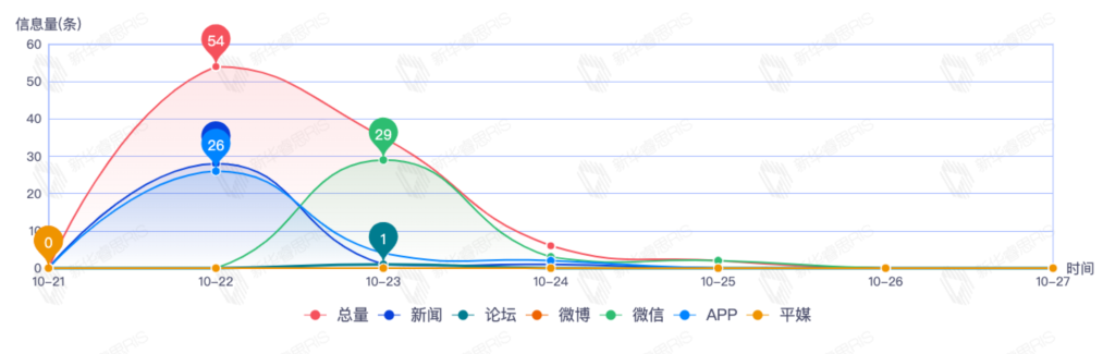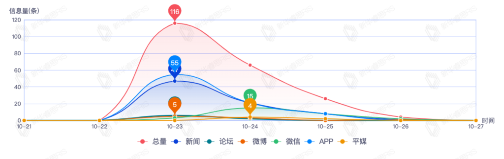 截至目前,该文章在互联网上传播总量212篇。其中10月23日是传播的高峰期,共传播116篇文章。各信源的信息发布情况中,新闻信息占比最大,其次是APP和微信,信息量分别为77、53、28,占比分别为42.54%、29.28%、15.47%。(数据来源:新华睿思数据云图分析平台)
