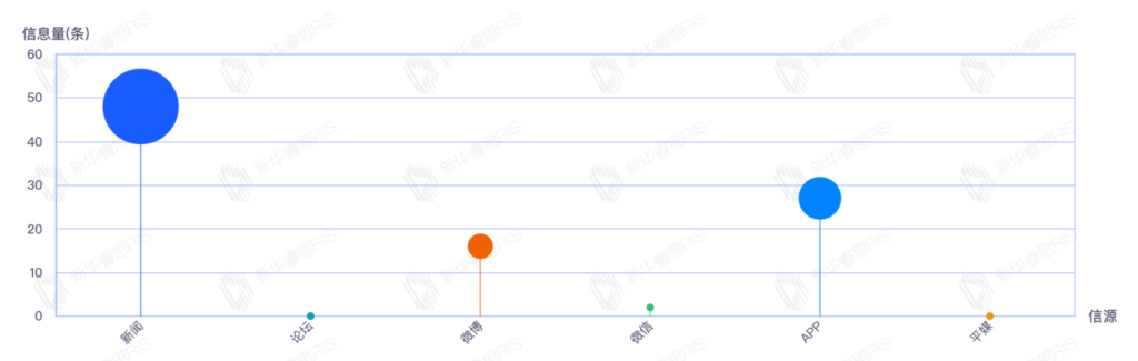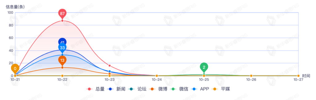 截至目前,该文章在互联网上传播总量106篇。其中10月22日是传播的高峰期,共传播87篇文章。各信源的信息发布情况中,新闻信息占比最大,其次是APP和微博,信息量分别为48、27、16,占比分别为51.61%、29.03%、17.20%。(数据来源:新华睿思数据云图分析平台)