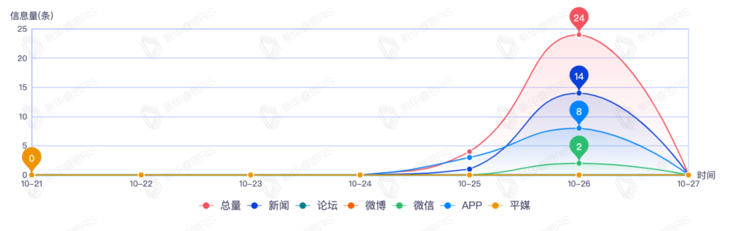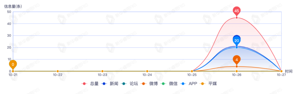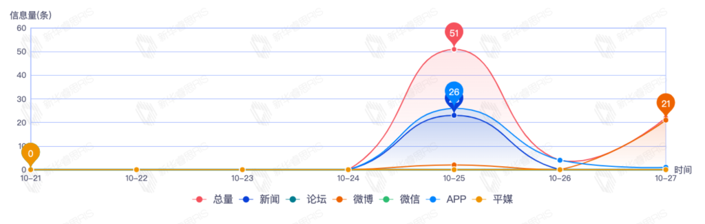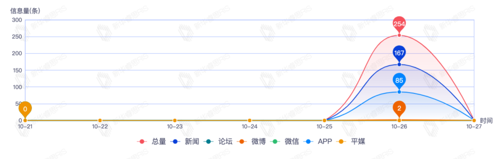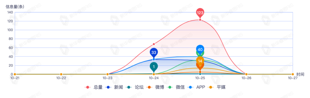 截至目前,该文章在互联网上传播总量191篇。其中10月25日是传播的高峰期,共传播123篇文章。各信源的信息发布情况中,新闻信息占比最大,其次是APP和微信,信息量分别为64、44、32,占比分别为39.75%、27.33%、19.88%。(数据来源:新华睿思数据云图分析平台)