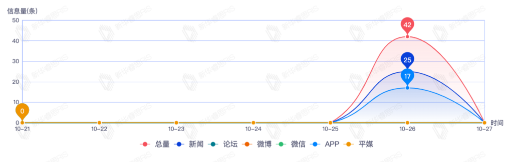 截至目前,该文章在互联网上传播总量42篇。其中10月26日是传播的高峰期,共传播42篇文章。各信源的信息发布情况中,新闻信息占比最大,其次是APP,信息量分别为25、11,占比分别为69.44%、30.56%。(数据来源:新华睿思数据云图分析平台)