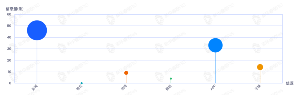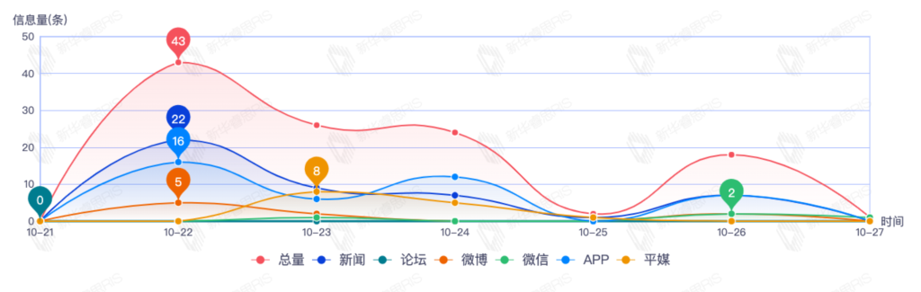 截至目前,该文章在互联网上传播总量114篇。其中10月22日是传播的高峰期,共传播43篇文章。各信源的信息发布情况中,新闻信息占比最大,其次是APP和平媒,信息量分别为46、33、14,占比分别为43.40%、31.13%、13.21%。(数据来源:新华睿思数据云图分析平台)