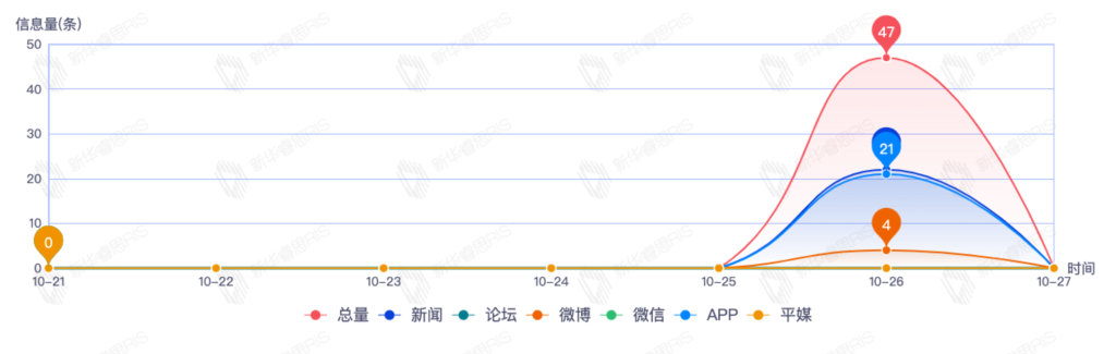 截至目前,该文章在互联网上传播总量47篇。其中10月26日是传播的高峰期,共传播47篇文章。各信源的信息发布情况中,新闻信息占比最大,其次是APP和微博,信息量分别为22、14、4,占比分别为55.00%、35.00%、10.00%。(数据来源:新华睿思数据云图分析平台)