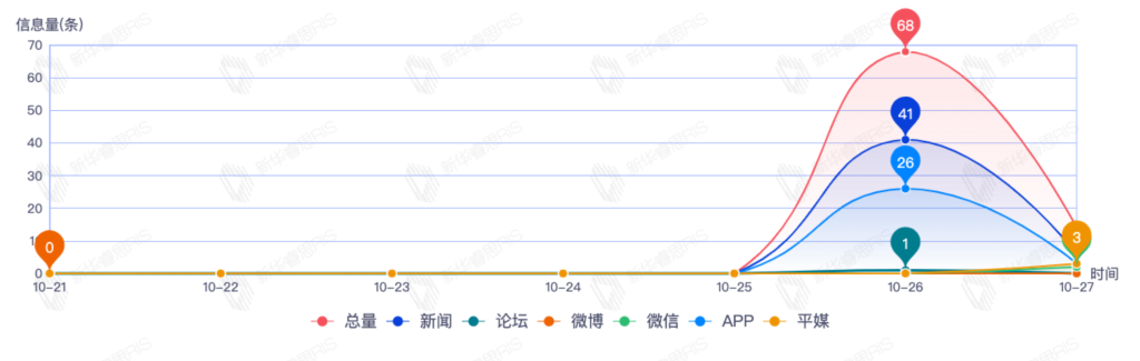 截至目前,该文章在互联网上传播总量82篇。其中10月26日是传播的高峰期,共传播68篇文章。各信源的信息发布情况中,新闻信息占比最大,其次是APP和平媒,信息量分别为47、20、3,占比分别为64.38%、27.40%、4.11%。(数据来源:新华睿思数据云图分析平台)