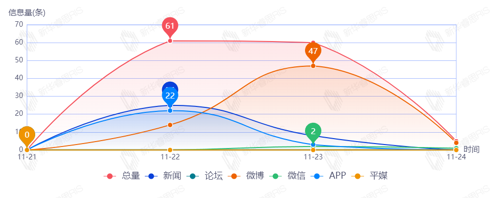 截至目前,该文章在互联网上传播总量60篇。其中11月19日是传播的高峰期,共传播47篇文章。各信源的信息发布情况中,新闻信息占比最大,其次是APP,占比分别为45.61%和38.60%。(数据来源:新华睿思数据云图分析平台)