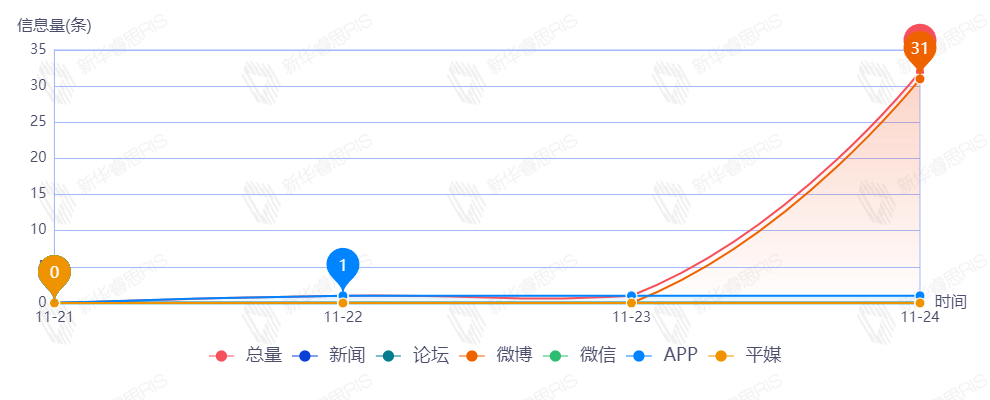 截至目前,该文章在互联网上传播总量34篇。其中11月24日是传播的高峰期,共传播31篇文章。各信源的信息发布情况中,微博占比最大,其次是APP,占比分别为93.94%和6.06%。(数据来源:新华睿思数据云图分析平台)