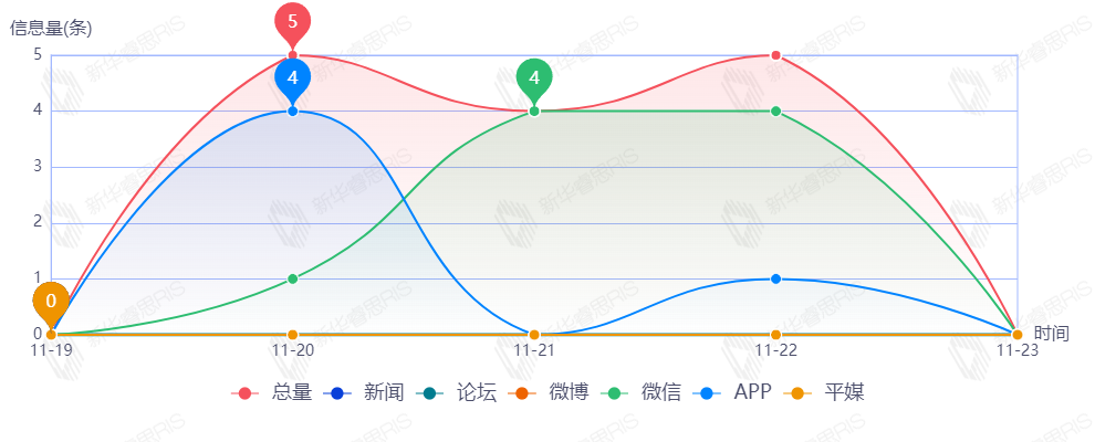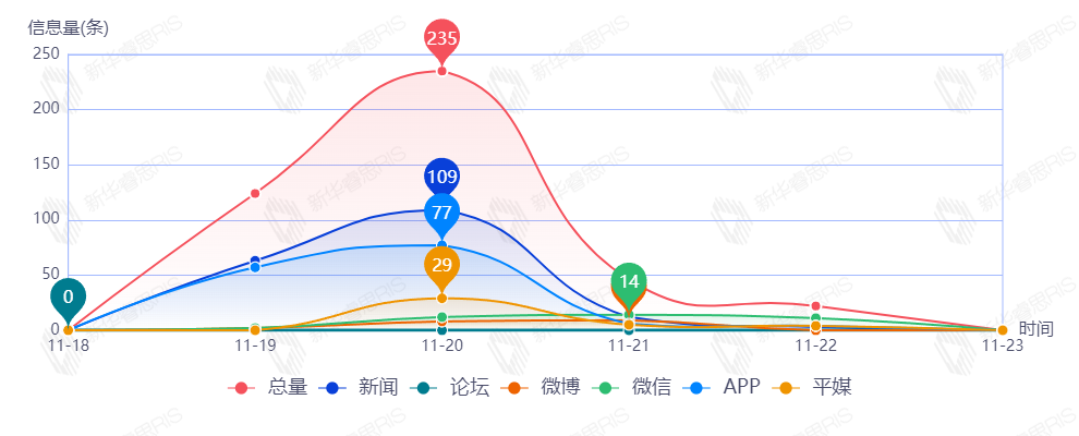 截至目前,该文章在互联网上传播总量427篇。其中11月20日是传播的高峰期,共传播235篇文章。各信源的信息发布情况中,新闻信息占比最大,其次是APP,占比分别为50.95%和22.89%。(数据来源:新华睿思数据云图分析平台)