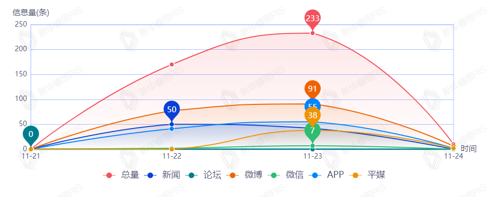 截至目前,该文章在互联网上传播总量413篇。其中11月23日是传播的高峰期,共传播233篇文章。各信源的信息发布情况中,微博占比最大,其次是新闻信息,占比分别为44.96%和23.77%。(数据来源:新华睿思数据云图分析平台)