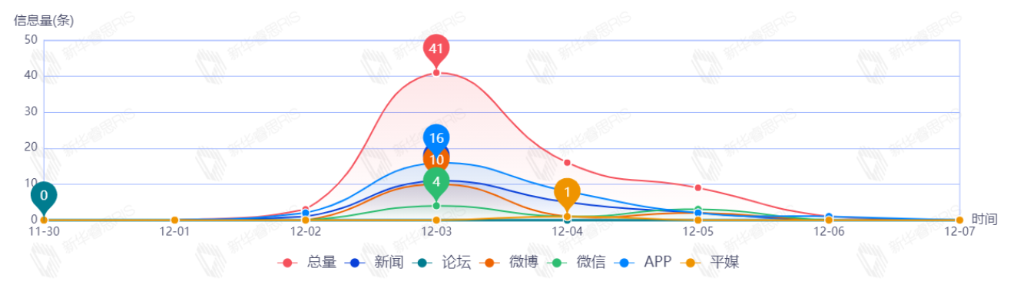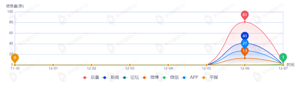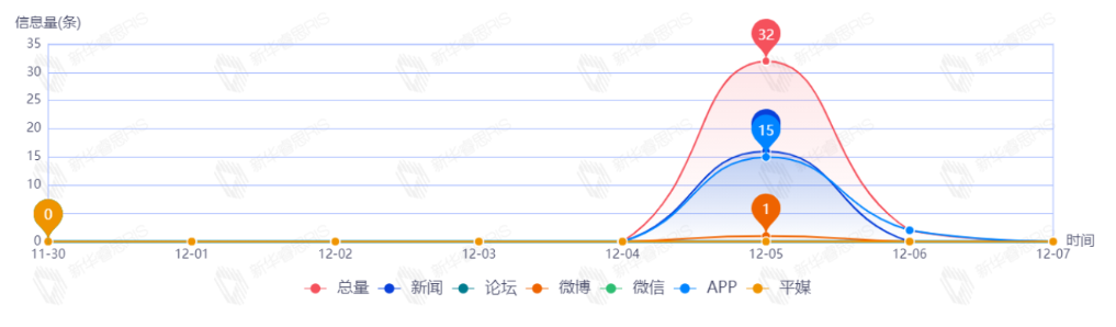 截至目前,该文章在互联网上传播总量共34篇。其中,12月5日是传播的高峰期,共传播32篇文章。各信源的信息发布情况中,新闻信息占比最大,其次是APP和微博,占比分别为50.00%、46.88%、3.13%。(数据来源:新华睿思·数媒智慧分析平台)