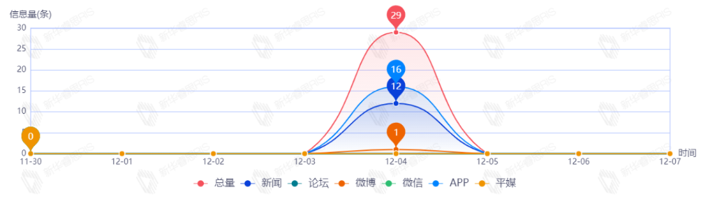 截至目前,该文章在互联网上传播总量共29篇。其中,12月4日是传播的高峰期,共传播29篇文章。各信源的信息发布情况中,新闻信息占比最大,其次是APP和微博,占比分别为50.00%、45.83%、4.17%。(数据来源:新华睿思·数媒智慧分析平台)