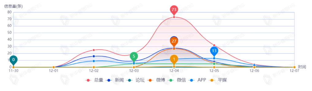 截至目前,该文章在互联网上传播总量共154篇。其中,12月4日是传播的高峰期,共传播73篇文章。各信源的信息发布情况中,新闻信息占比最大,其次是APP和微博,占比分别为42.47%、23.97%、22.60%。(数据来源:新华睿思·数媒智慧分析平台)
