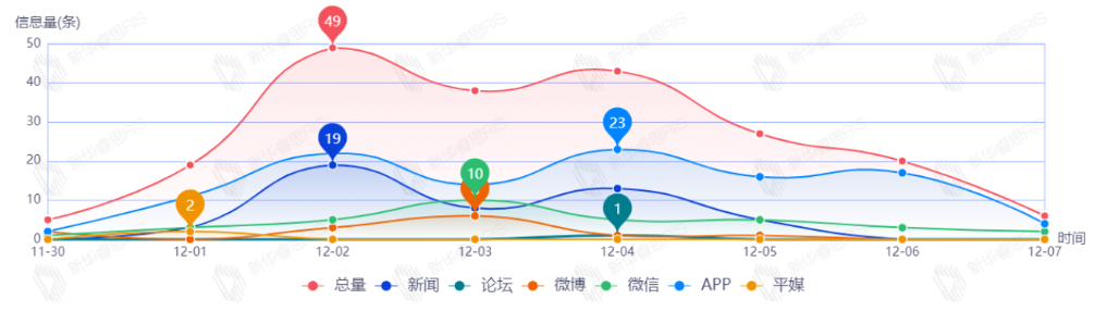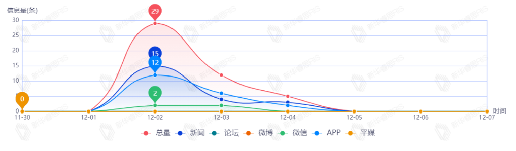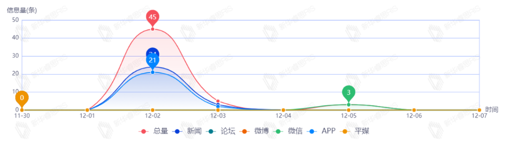 截至目前,该文章在互联网上传播总量共49篇。其中,12月2日是传播的高峰期,共传播29篇文章。各信源的信息发布情况中,新闻信息占比最大,其次是APP和微信,占比分别为51.16%、39.53%、9.30%.(数据来源:新华睿思·数媒智慧分析平台)