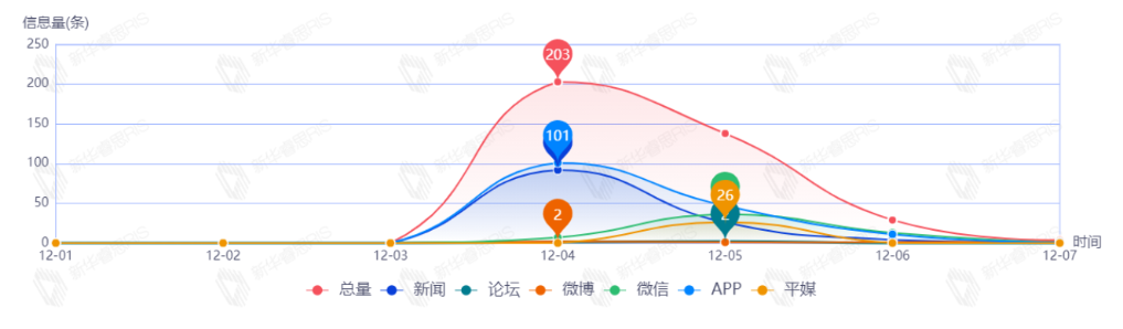 截至目前,该文章在互联网上传播总量共374篇。其中,12月4日是传播的高峰期,共传播203篇文章。各信源的信息发布情况中,新闻信息占比最大,其次是APP和微信,占比分别为38.32%、33.64%、17.45%。(数据来源:新华睿思·数媒智慧分析平台)