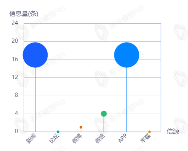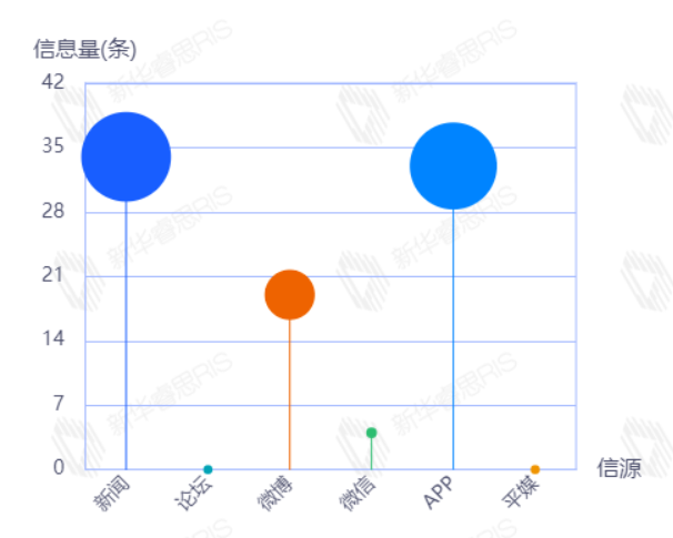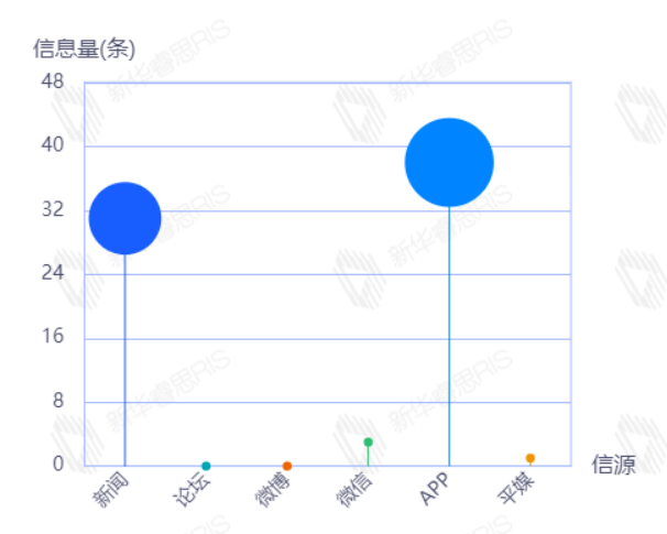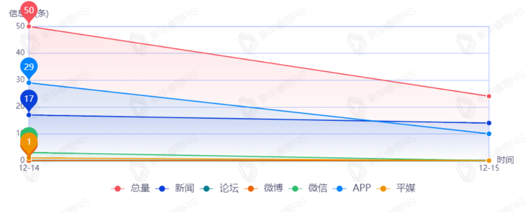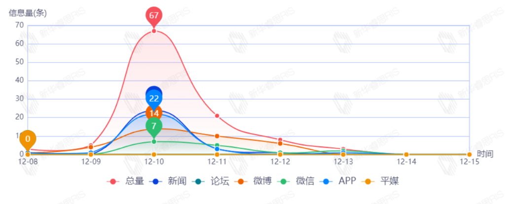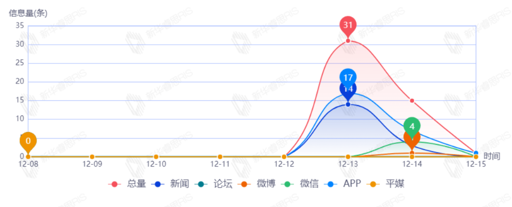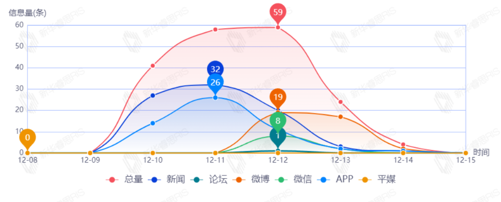 截至目前,该文章在互联网上传播总量186篇。其中12月12日是传播的高峰期,共传播59篇文章。各信源的信息发布情况中,新闻信息占比最大,其次是APP和微博,占比分别为46.63%、25.84%、21.35%。(数据来源:新华睿思数据云图分析平台)