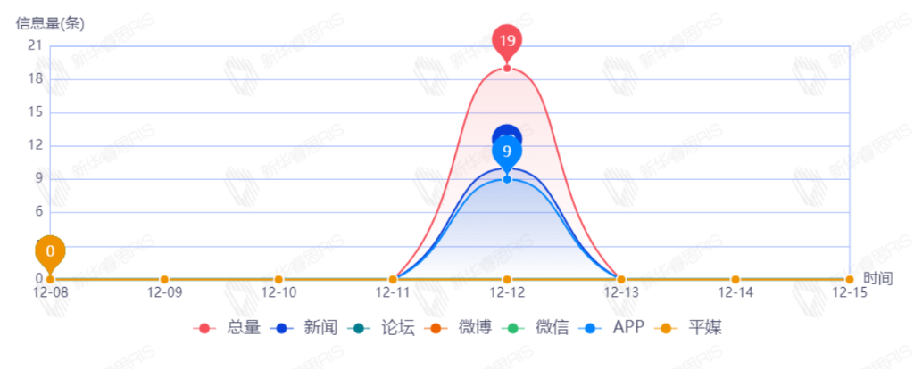 截至目前,该文章在互联网上传播总量19篇。其中12月12日是传播的高峰期,共传播19篇文章。各信源的信息发布情况中,新闻信息占比最大,其次是APP,占比分别为58.82%、41.18%。(数据来源:新华睿思数据云图分析平台)