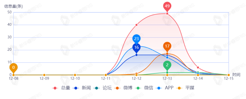截至目前,该文章在互联网上传播总量95篇。其中12月13日是传播的高峰期,共传播49篇文章。各信源的信息发布情况中,新闻信息占比最大,其次是APP和微博,占比分别为37.78%、36.67%、21.11%。(数据来源:新华睿思数据云图分析平台)