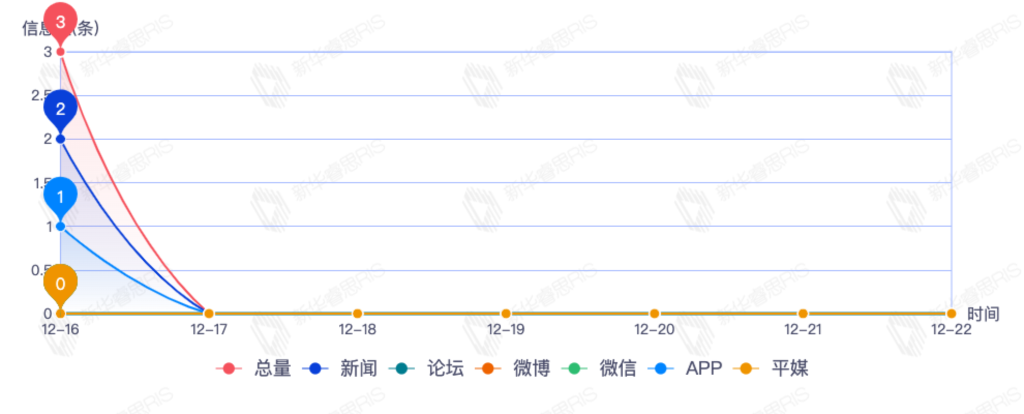 截至目前,该文章在互联网上传播总量3篇。其中12月16日是传播的高峰期,共传播3篇文章。各信源的信息发布情况中,新闻信息占比最大,其次是APP,信息量分别为2、1,占比分别为66.67%、33.33%。(数据来源:新华睿思数据云图分析平台)