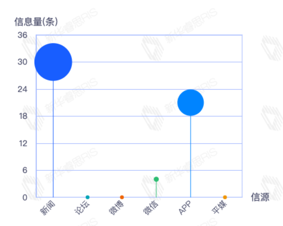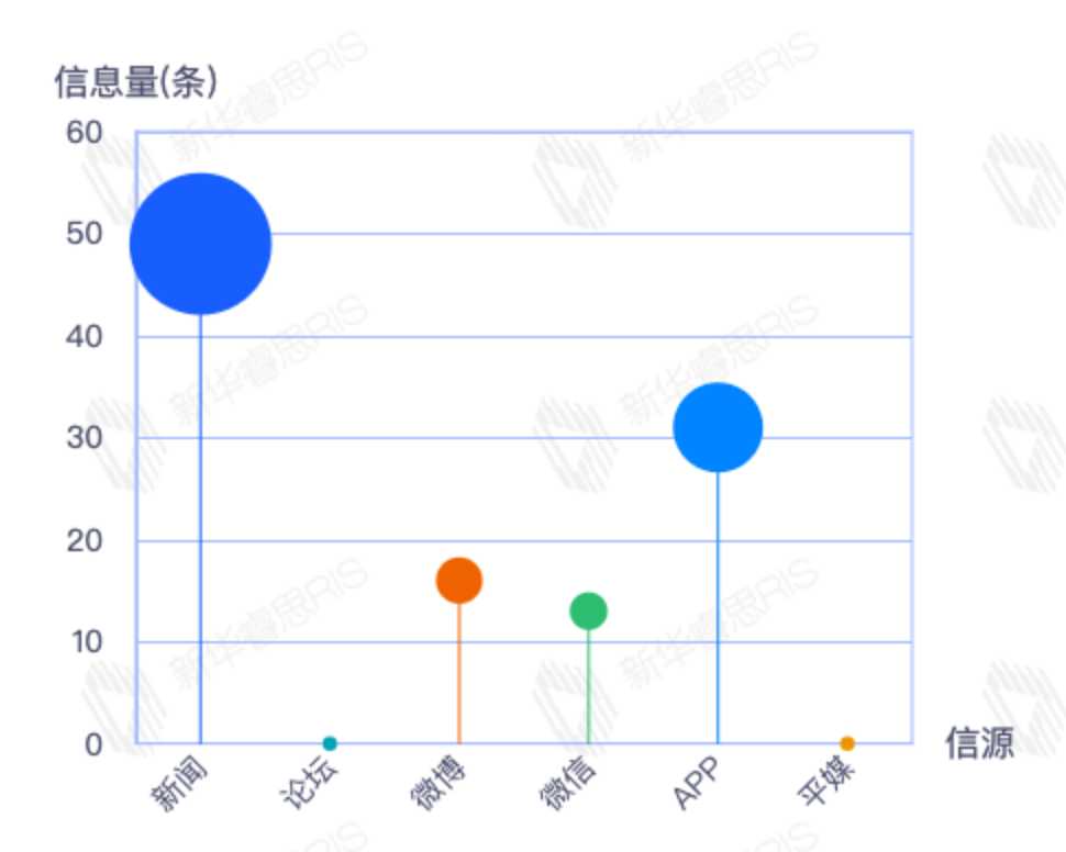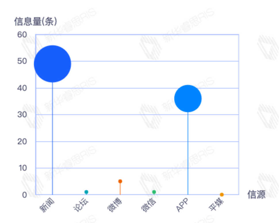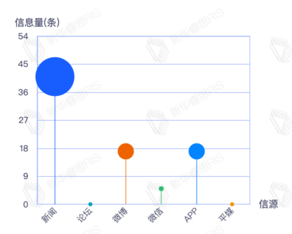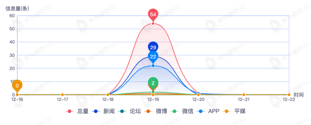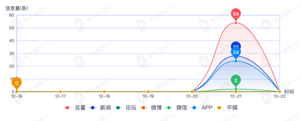 截至目前,该文章在互联网上传播总量54篇。其中12月21日是传播的高峰期,共传播54篇文章。各信源的信息发布情况中,新闻信息占比最大,其次是APP和微信,信息量分别为28、21、2,占比分别为54.90%、41.18%、3.92%。(数据来源:新华睿思数据云图分析平台)