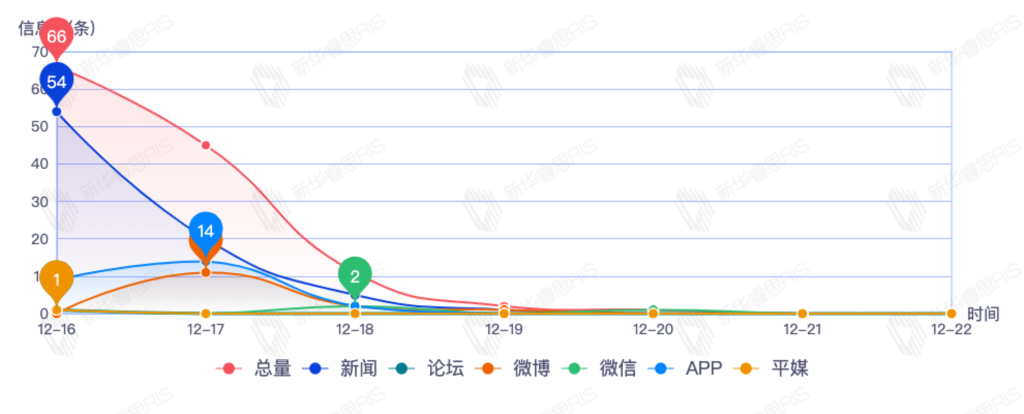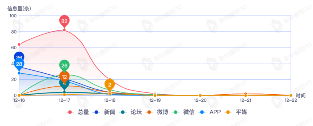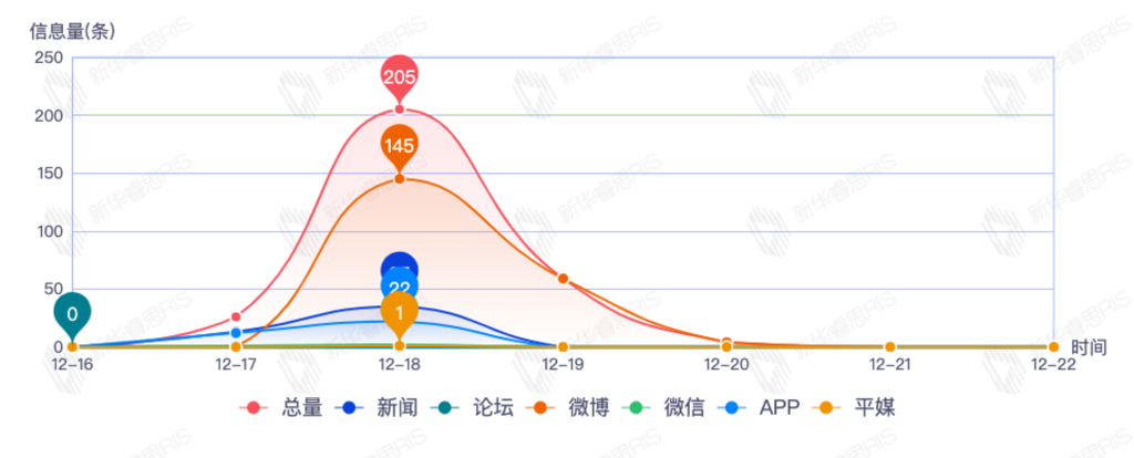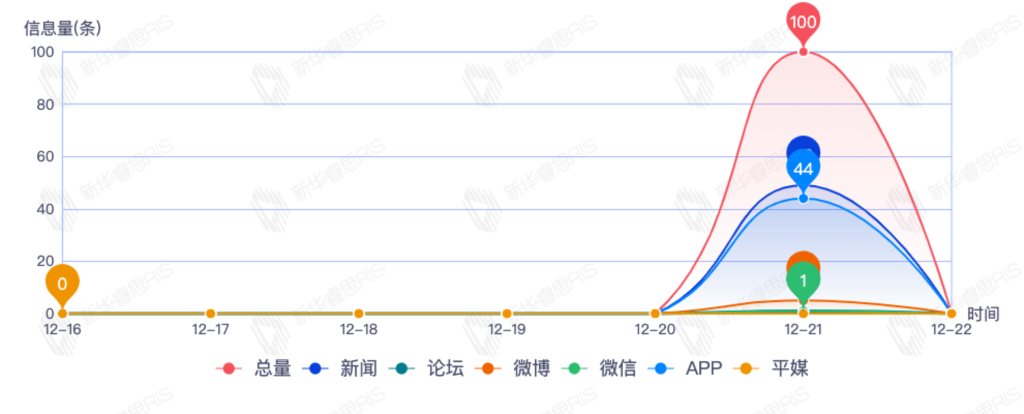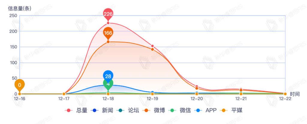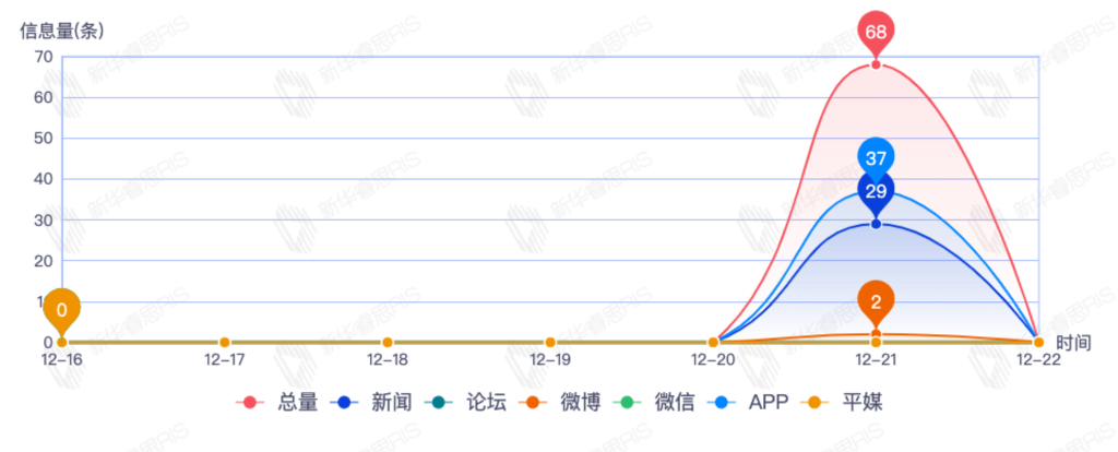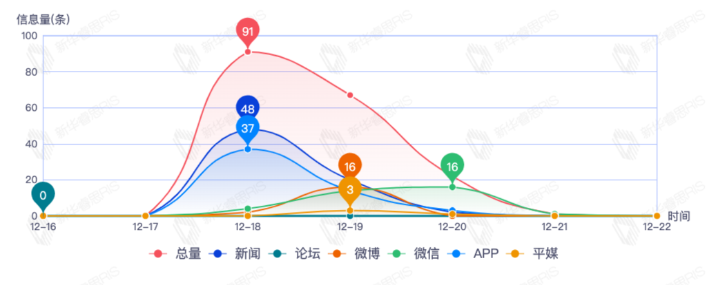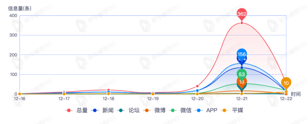 截至目前,该文章在互联网上传播总量492篇。其中12月21日是传播的高峰期,共传播362篇文章。各信源的信息发布情况中,新闻信息占比最大,其次是APP和微信,信息量分别为181、177、73,占比分别为39.09%、38.23%、15.77%。(数据来源:新华睿思数据云图分析平台)