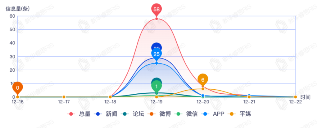 截至目前,该文章在互联网上传播总量151篇。其中12月19日是传播的高峰期,共传播89篇文章。各信源的信息发布情况中,APP信息占比最大,其次是新闻和平媒,信息量分别为58、54、8,占比分别为43.94%、40.91%、6.06%。(数据来源:新华睿思数据云图分析平台)
