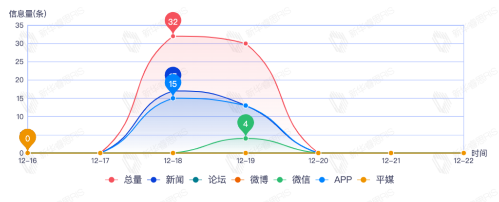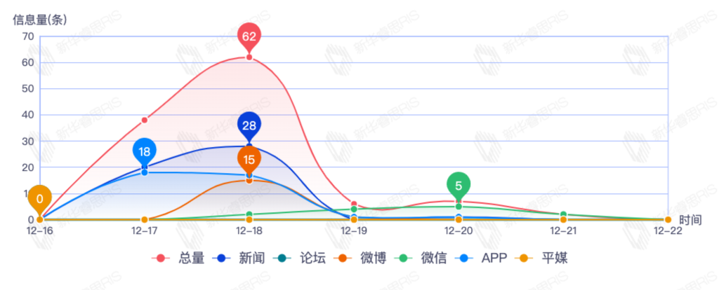截至目前,该文章在互联网上传播总量62篇。其中12月18日是传播的高峰期,共传播32篇文章。各信源的信息发布情况中,新闻信息占比最大,其次是APP和微信,信息量分别为30、21、4,占比分别为54.55%、38.18%、7.27%。(数据来源:新华睿思数据云图分析平台)