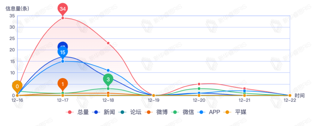 截至目前,该文章在互联网上传播总量67篇。其中12月17日是传播的高峰期,共传播34篇文章。各信源的信息发布情况中,APP信息占比最大,其次是新闻和微信,信息量分别为28、26、10,占比分别为42.42%、39.39%、15.15%。(数据来源:新华睿思数据云图分析平台)