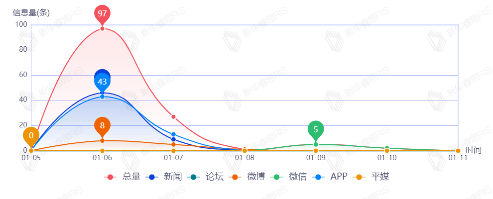 截至目前,该文章在互联网上传播总量132篇。其中1月6日是传播的高峰期,共传播97篇文章。各信源的信息发布情况中,新闻信息占比最大,其次是APP和微博,占比分别为43.21%、41.54%和10.77%。(数据来源:新华睿思数据云图分析平台)