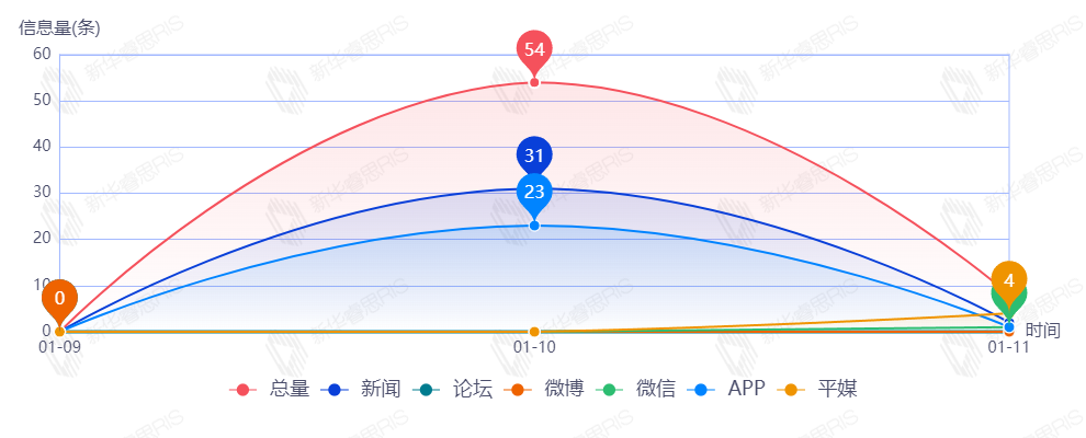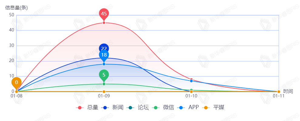截至目前,该文章在互联网上传播总量53篇。其中1月9日是传播的高峰期,共传播45篇文章。各信源的信息发布情况中,APP占比最大,其次是新闻信息,占比分别为46.15%和42.31%。(数据来源:新华睿思数据云图分析平台)