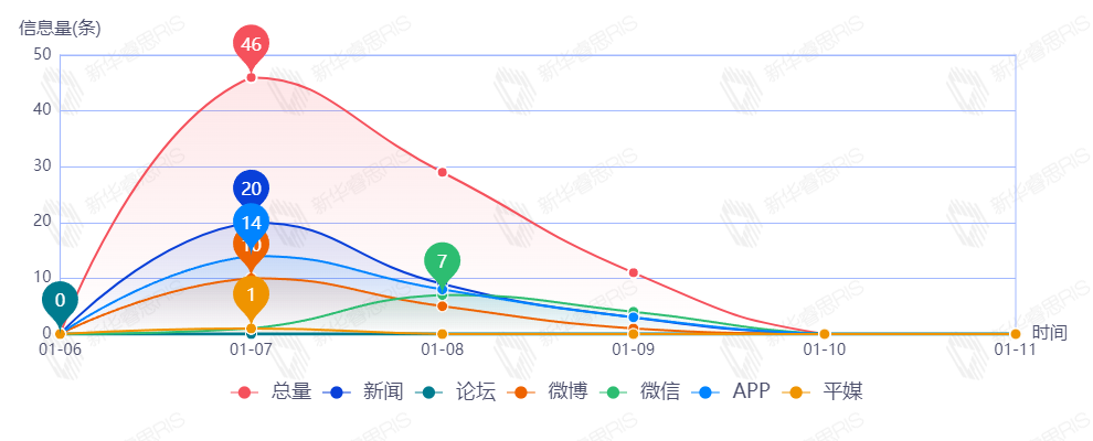 截至目前,该文章在互联网上传播总量86篇。其中1月7日是传播的高峰期,共传播46篇文章。各信源的信息发布情况中,新闻信息占比最大,其次是APP,占比分别为37.21%和29.07%。(数据来源:新华睿思数据云图分析平台)