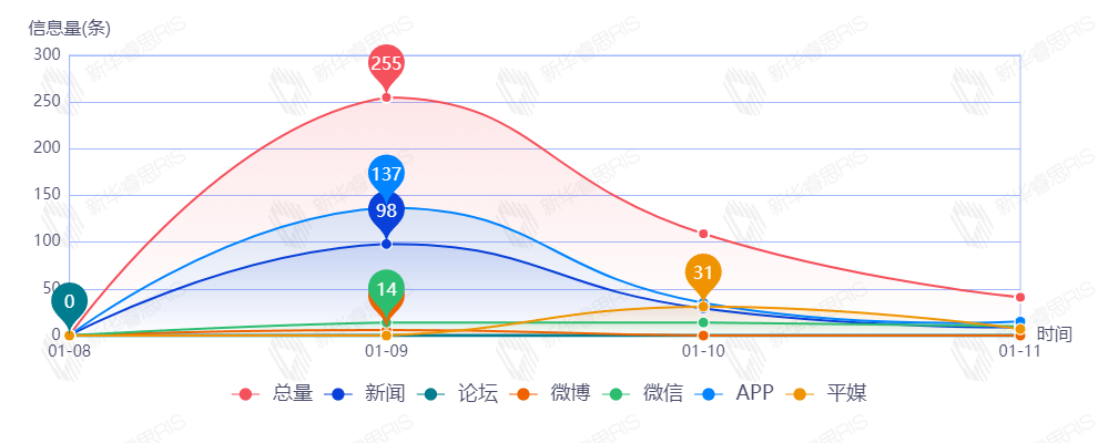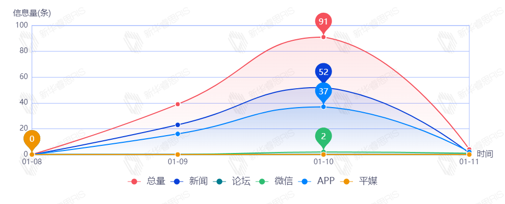 截至目前,该文章在互联网上传播总量134篇。其中1月10日是传播的高峰期,共传播91篇文章。各信源的信息发布情况中,新闻信息占比最大,其次是APP,占比分别为57.58%和40.15%。(数据来源:新华睿思数据云图分析平台)