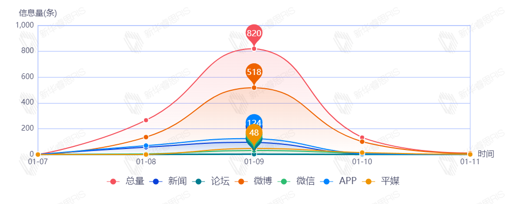 截至目前,该文章在互联网上传播总量1230篇。其中1月9日是传播的高峰期,共传播820篇文章。各信源的信息发布情况中,微博占比最大,其次是APP,占比分别为62.64%和15.35%。(数据来源:新华睿思数据云图分析平台)