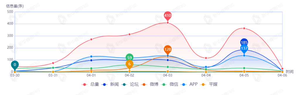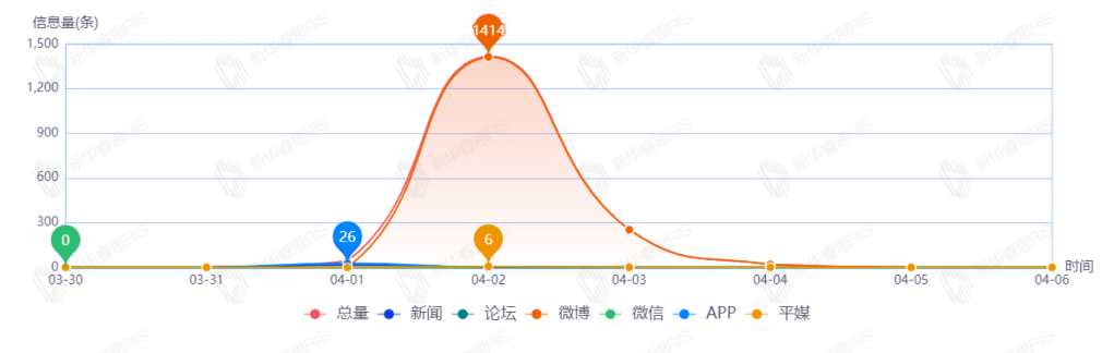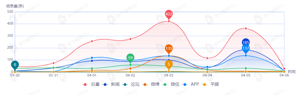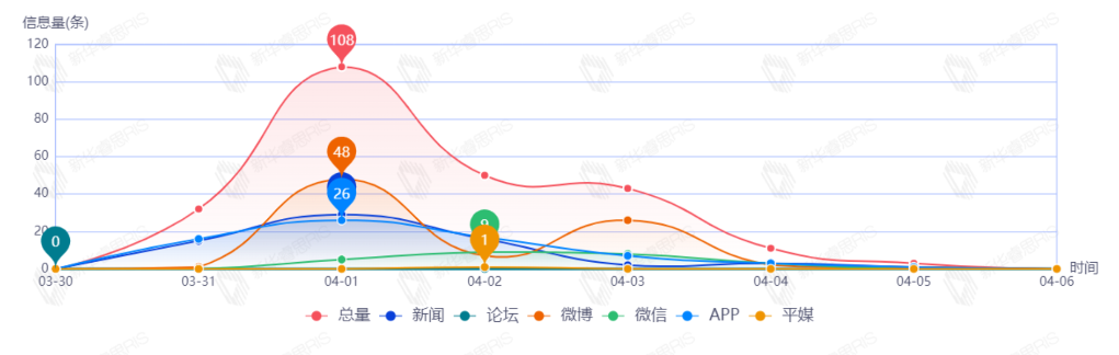 截至目前,该文章在互联网上传播总量1578篇。其中4月3日是传播的高峰期,共传播422篇文章。各信源的信息发布情况中,新闻信息占比最大,其次是APP和微信,占比分别为34.81%、34.81%、16.55%。(数据来源:新华睿思数据云图分析平台)