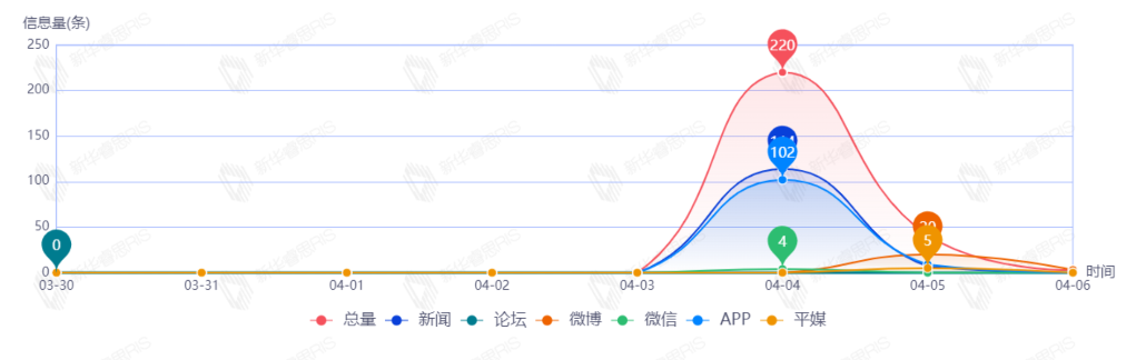 截至目前,该文章在互联网上传播总量264篇。其中4月4日是传播的高峰期,共传播220篇文章。各信源的信息发布情况中,新闻信息占比最大,其次是APP和微博,占比分别为45.83%、42.05%、8.71%。(数据来源:新华睿思数据云图分析平台)