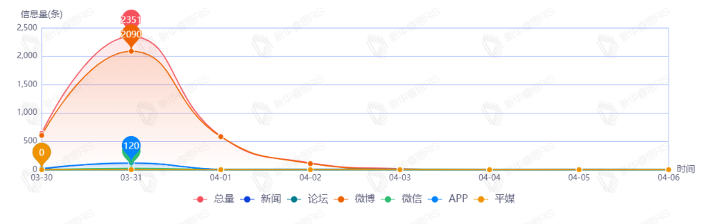 截至目前,该文章在互联网上传播总量3725篇。其中3月31日是传播的高峰期,共传播2351篇文章。各信源的信息发布情况中,微博信息占比最大,其次是APP和新闻,占比分别为90.93%、4.08%、3.73%。(数据来源:新华睿思数据云图分析平台)