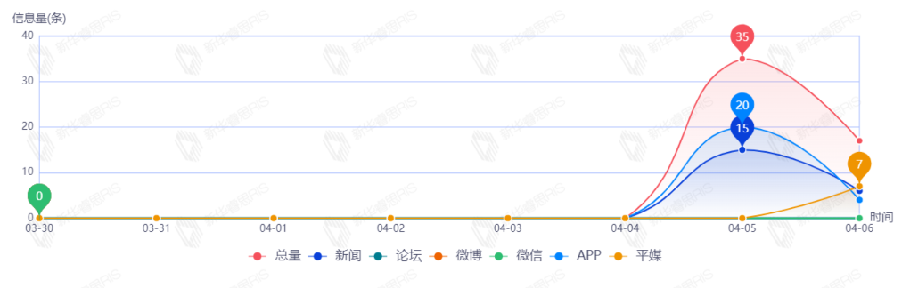 截至目前,该文章在互联网上传播总量52篇。其中4月5日是传播的高峰期,共传播35篇文章。各信源的信息发布情况中,APP信息占比最大,其次是新闻和平媒,占比分别为46.15%、40.38%、13.46%。(数据来源:新华睿思数据云图分析平台)
