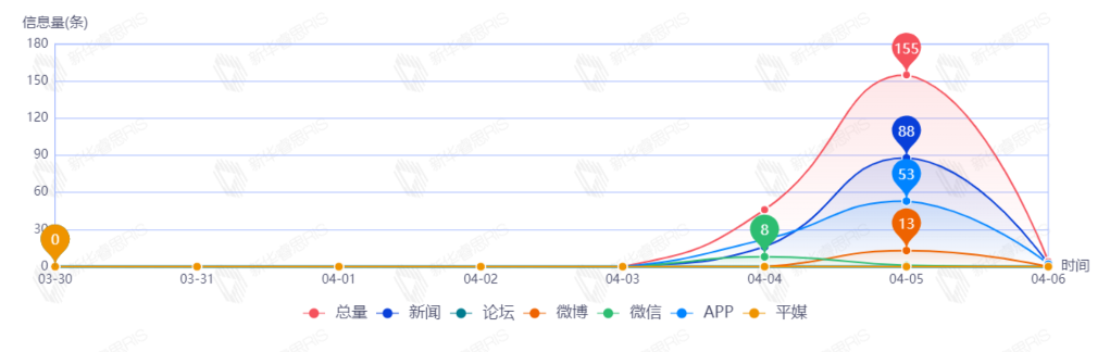 截至目前,该文章在互联网上传播总量205篇。其中4月5日是传播的高峰期,共传播155篇文章。各信源的信息发布情况中,新闻信息占比最大,其次是APP和微博,占比分别为51.71%、37.56%、6.34%。(数据来源:新华睿思数据云图分析平台)