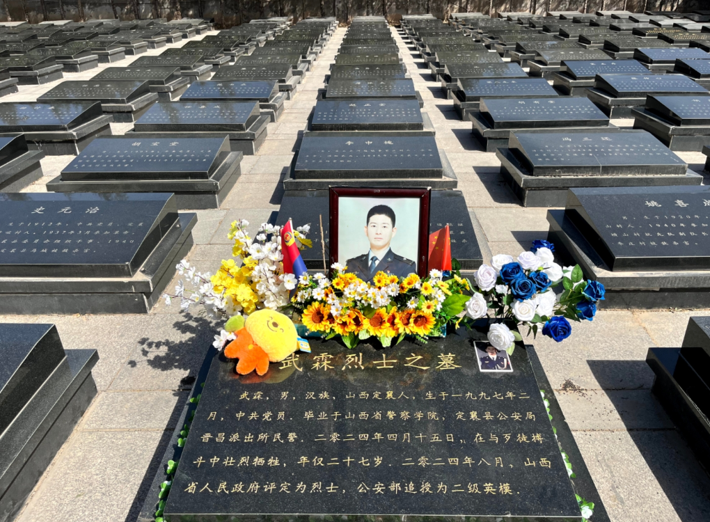2024年4月15日,在山西省忻州市定襄县宽沟村附近的山坡上,定襄县公安局晋昌派出所民警武霖在辖区依法对一身份可疑男子进行核查的过程中,突遭对方持刀袭击,经全力抢救无效,27岁的青春定格在了鲜花满坡的春天。(新华社记者万倩仪、樊欣阳)