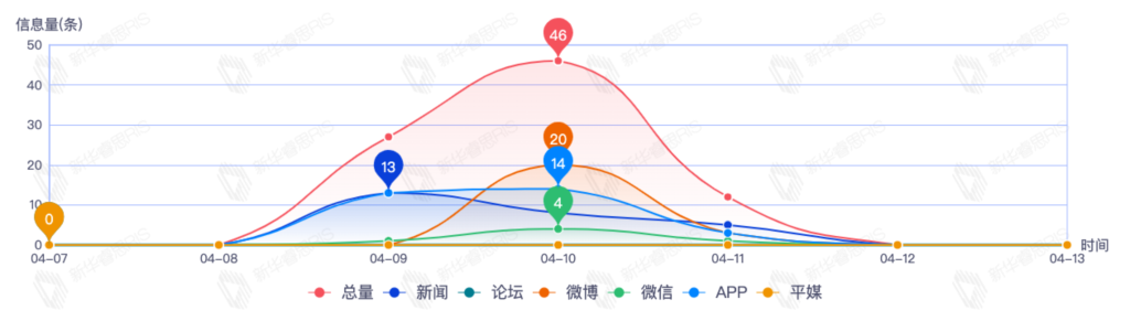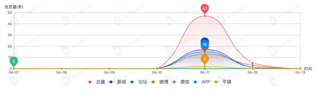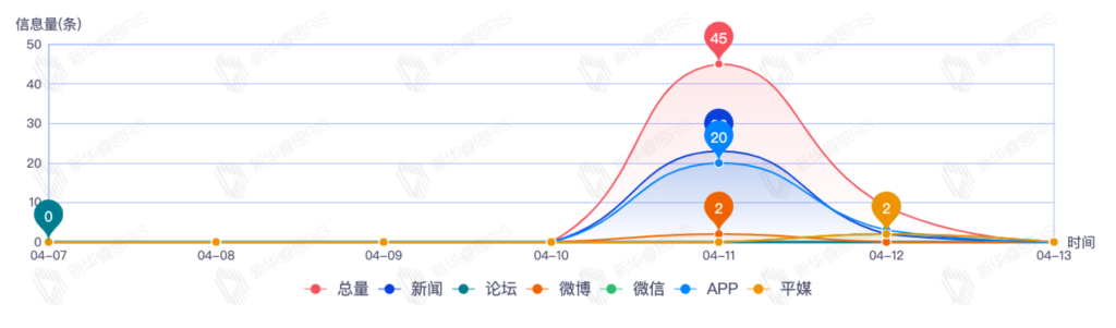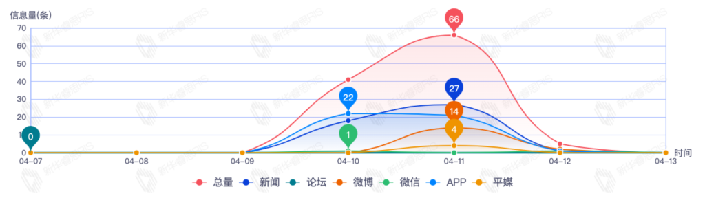 截至目前,该文章在互联网上传播总量52篇。其中4月11日是传播的高峰期,共传播47篇文章。各信源的信息发布情况中,新闻信息占比最大,其次是微博和APP,信息量分别为18、16、16,占比分别为34.62%、30.77%、30.77%。(数据来源:新华睿思数据云图分析平台)