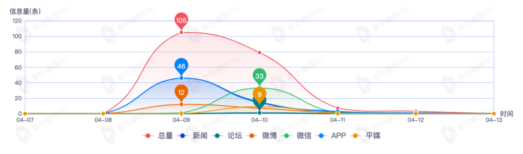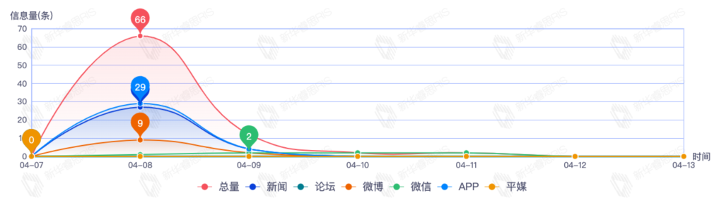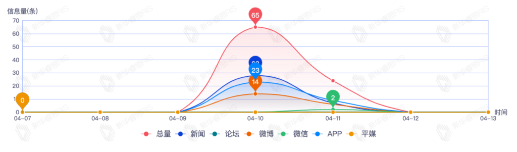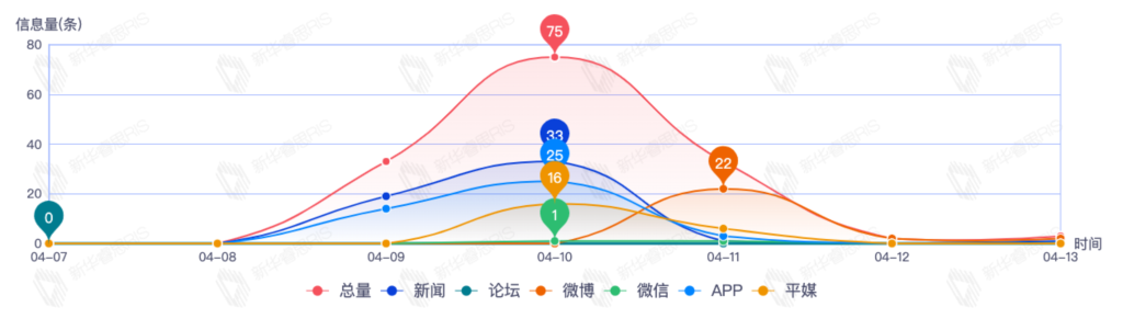 截至目前,该文章在互联网上传播总量89篇。其中4月10日是传播的高峰期,共传播65篇文章。各信源的信息发布情况中,新闻信息占比最大,其次是APP和微博,信息量分别为35、32、20,占比分别为39.33%、35.96%、22.47%。(数据来源:新华睿思数据云图分析平台)