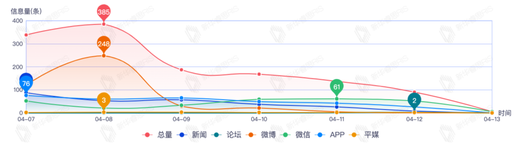 截至目前,该文章在互联网上传播总量182篇。其中4月8日是传播的高峰期,共传87篇文章。各信源的信息发布情况中,微博信息占比最大,其次是APP和新闻,信息量分别为59、56、52,占比分别为32.42%、30.77%、28.57%。(数据来源:新华睿思数据云图分析平台)