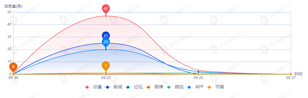 截至目前,该文章在互联网上传播总量50篇。其中4月25日是传播的高峰期,共传播47篇文章。各信源的信息发布情况中,新闻信息占比最大,其次是APP和微信,占比分别为50.00%、44.00%、4.00%。(数据来源:新华睿思数据云图分析平台)