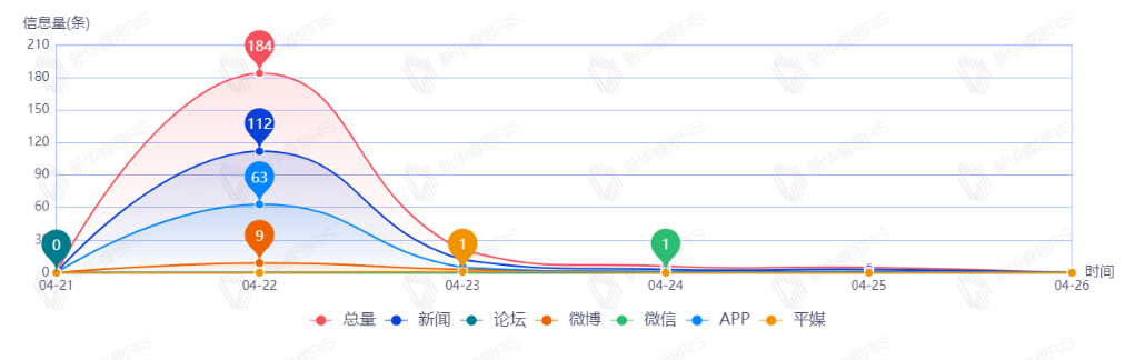 截至目前,该文章在互联网上传播总量216篇。其中4月22日是传播的高峰期,共传播184篇文章。各信源的信息发布情况中,新闻信息占比最大,其次是APP和微博,占比分别为60.19%、32.41%、6.48%。(数据来源:新华睿思数据云图分析平台)